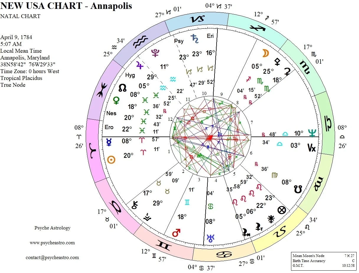USA New Chart – USA is an Aries, not a Cancer: I’m working with a new chart for the USA based on what I consider the birth date of the nation, and it is not July 4th, 1776. To me, that is the conception date, and, while very important to the ethos of the nation and its intent, if we are considering when an entity is born, that is when it is fully separated from it’s “mother” and an autonomous being, breathing on its own. This date that I am working with is the day that King George III signed the ratification of the Treaty of Paris, making it final and enacting it into law. That date was April 9, 1874. This does coincide with the July 4th chart quite a lot actually, which is helpful because that chart has been rectified and analyzed to death. There are multiple versions of the “USA Birth Chart” out there, and this alternative one is not new. But it has pinged my consciousness in a way that I can’t ignore.